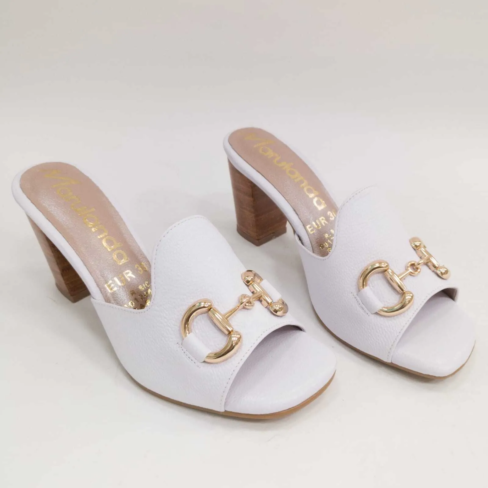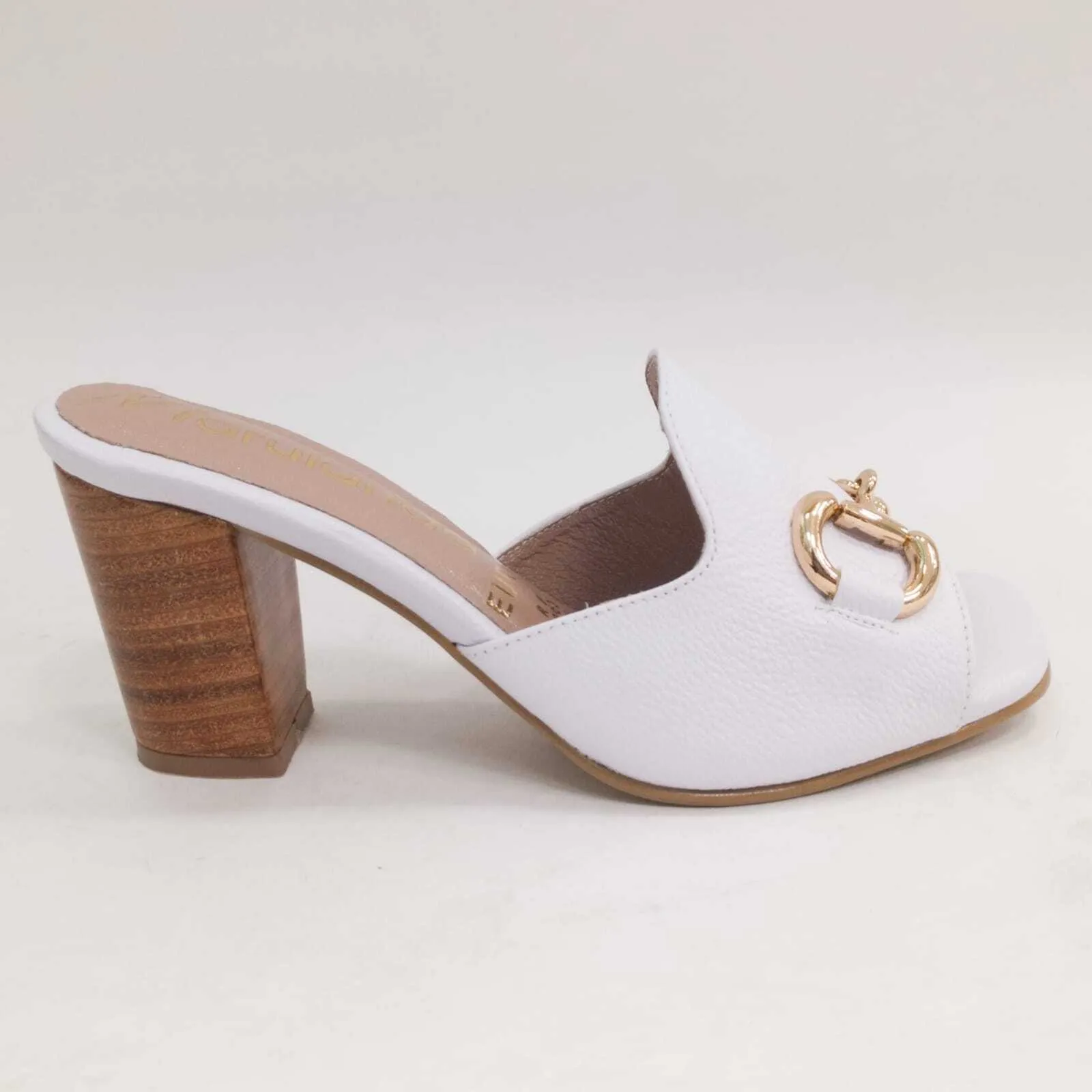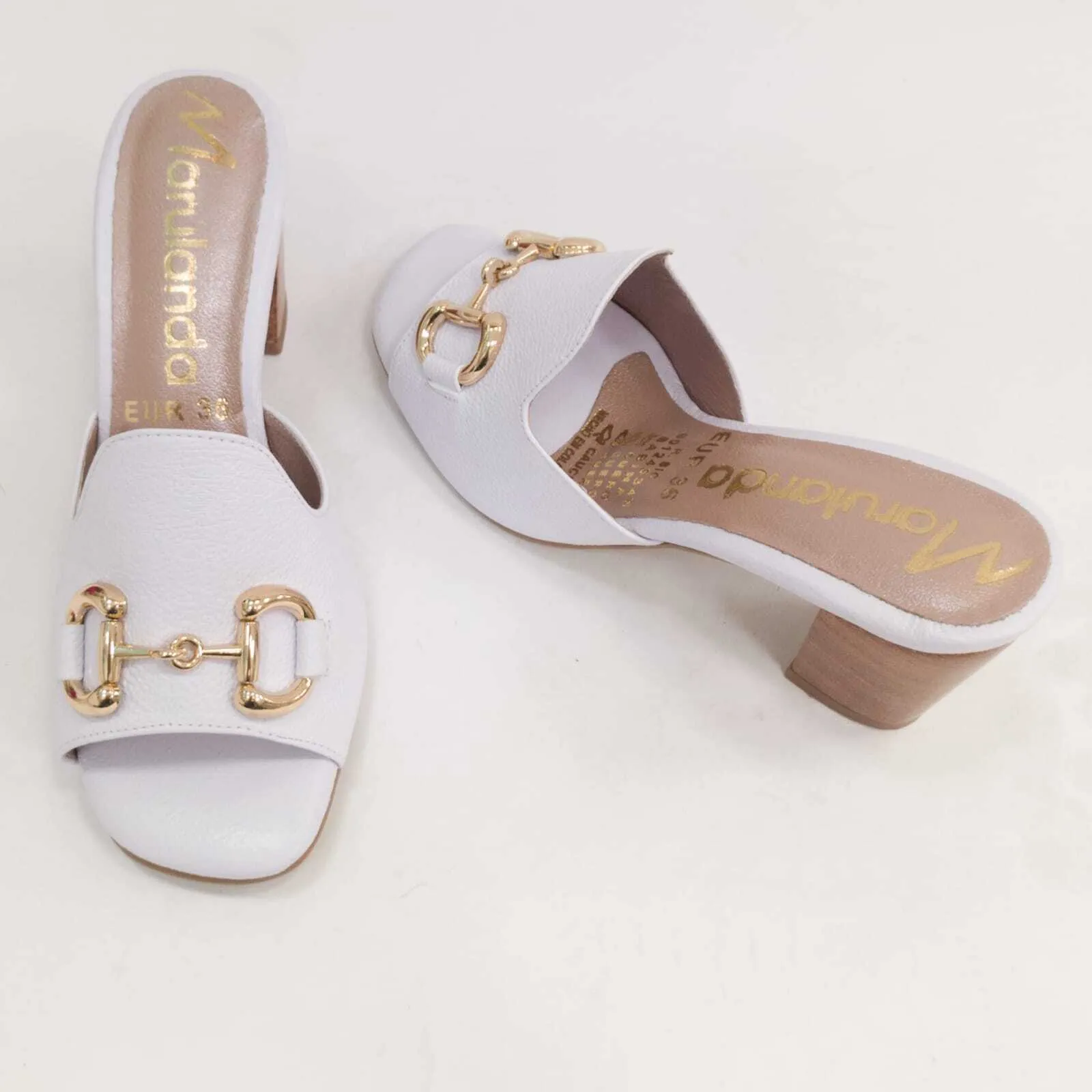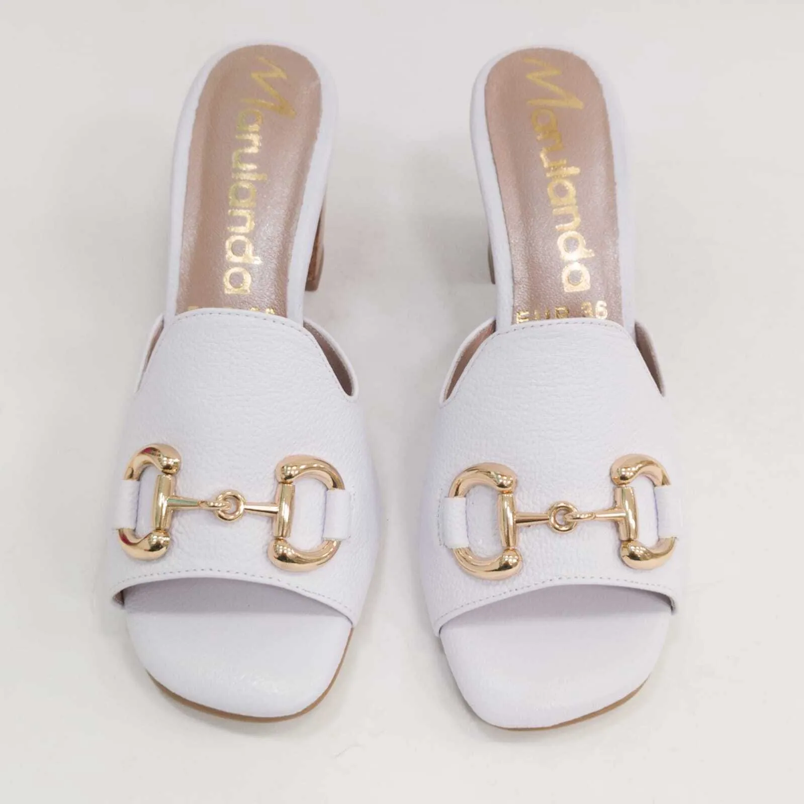 Sandalia sueca en cuero tipo napa color blanco con herraje dorado sobre la capellada.