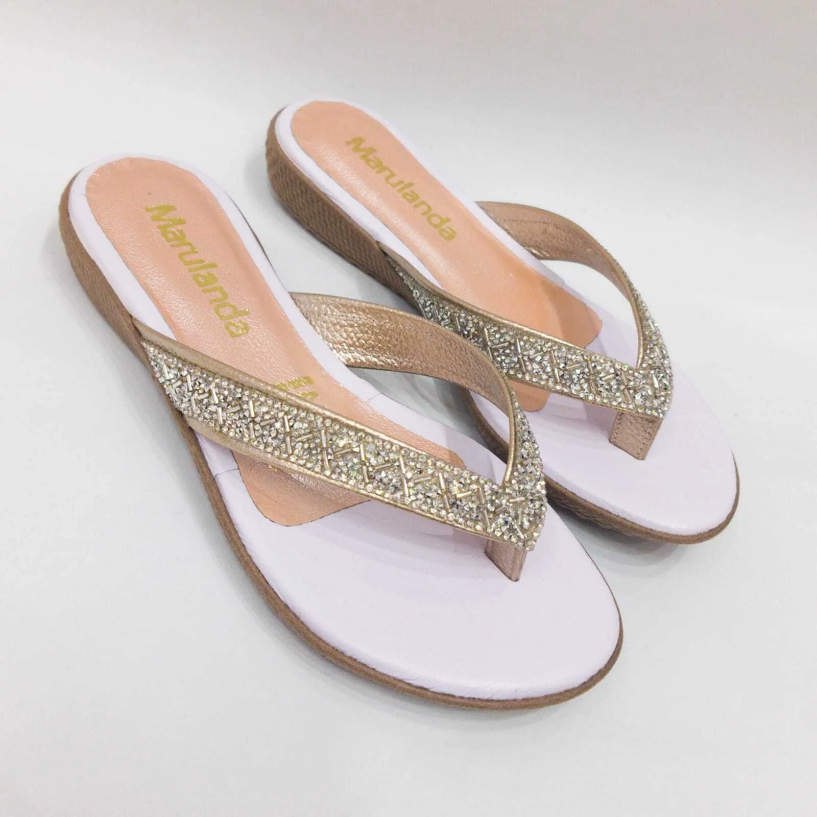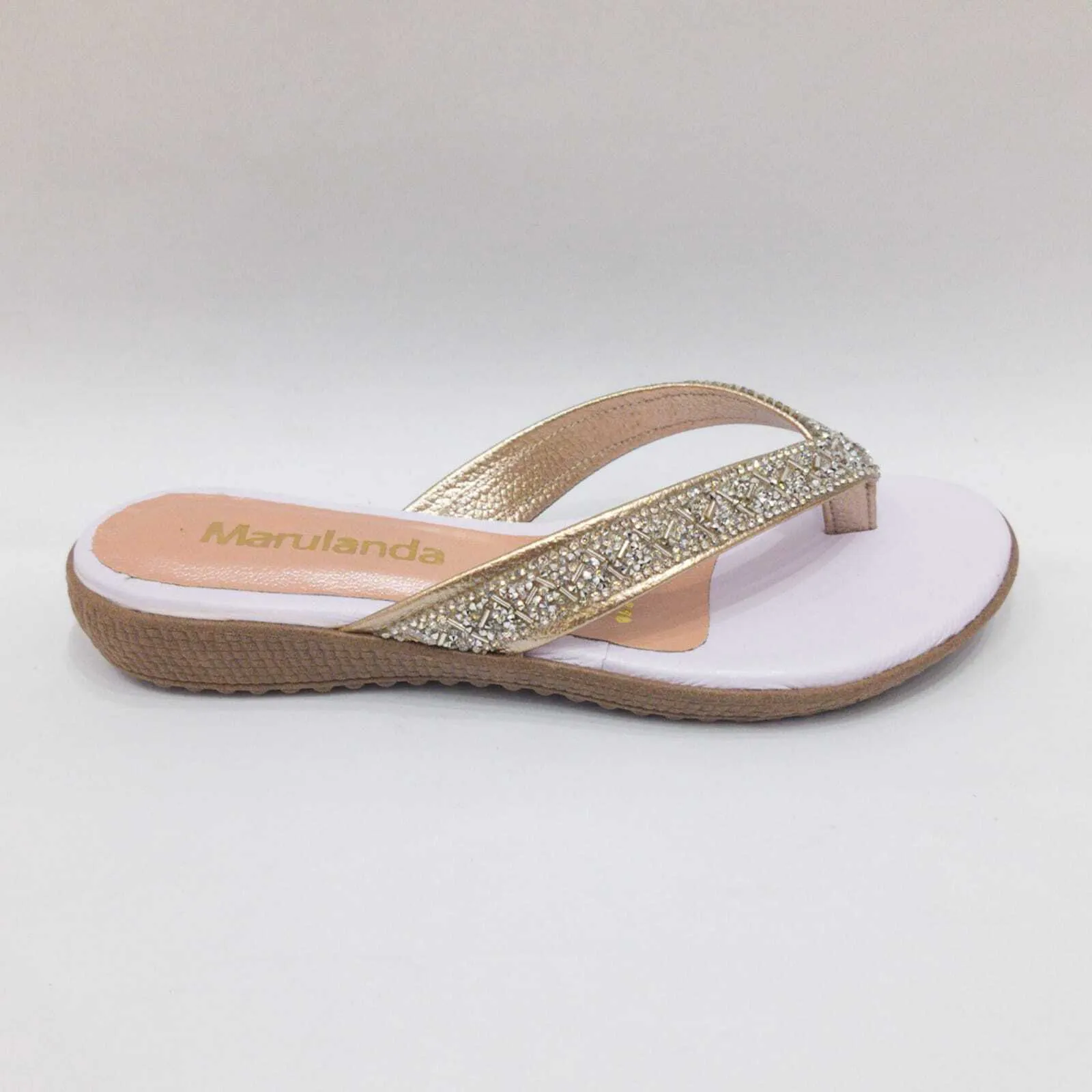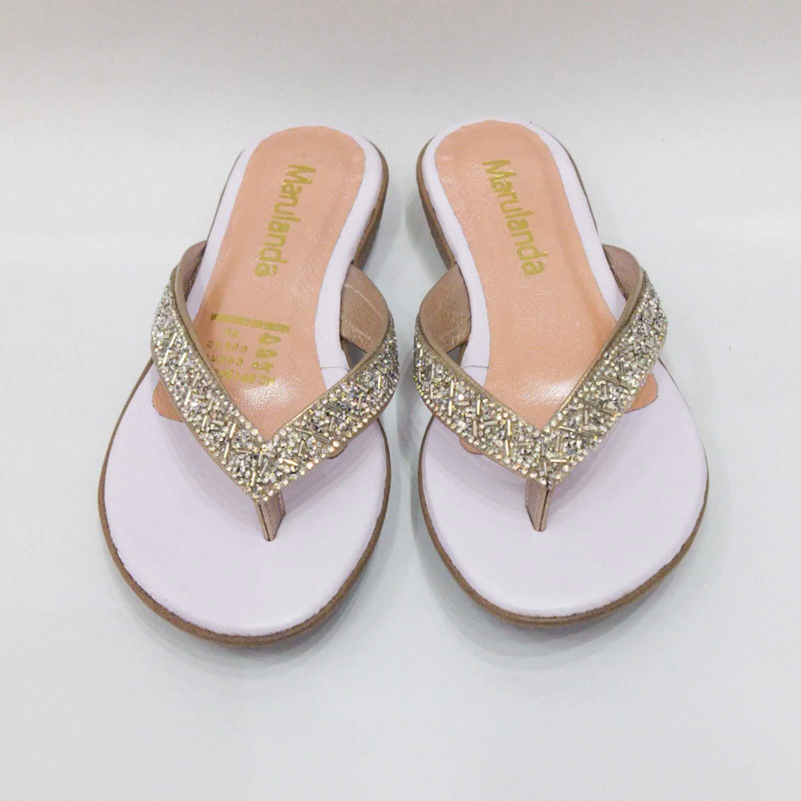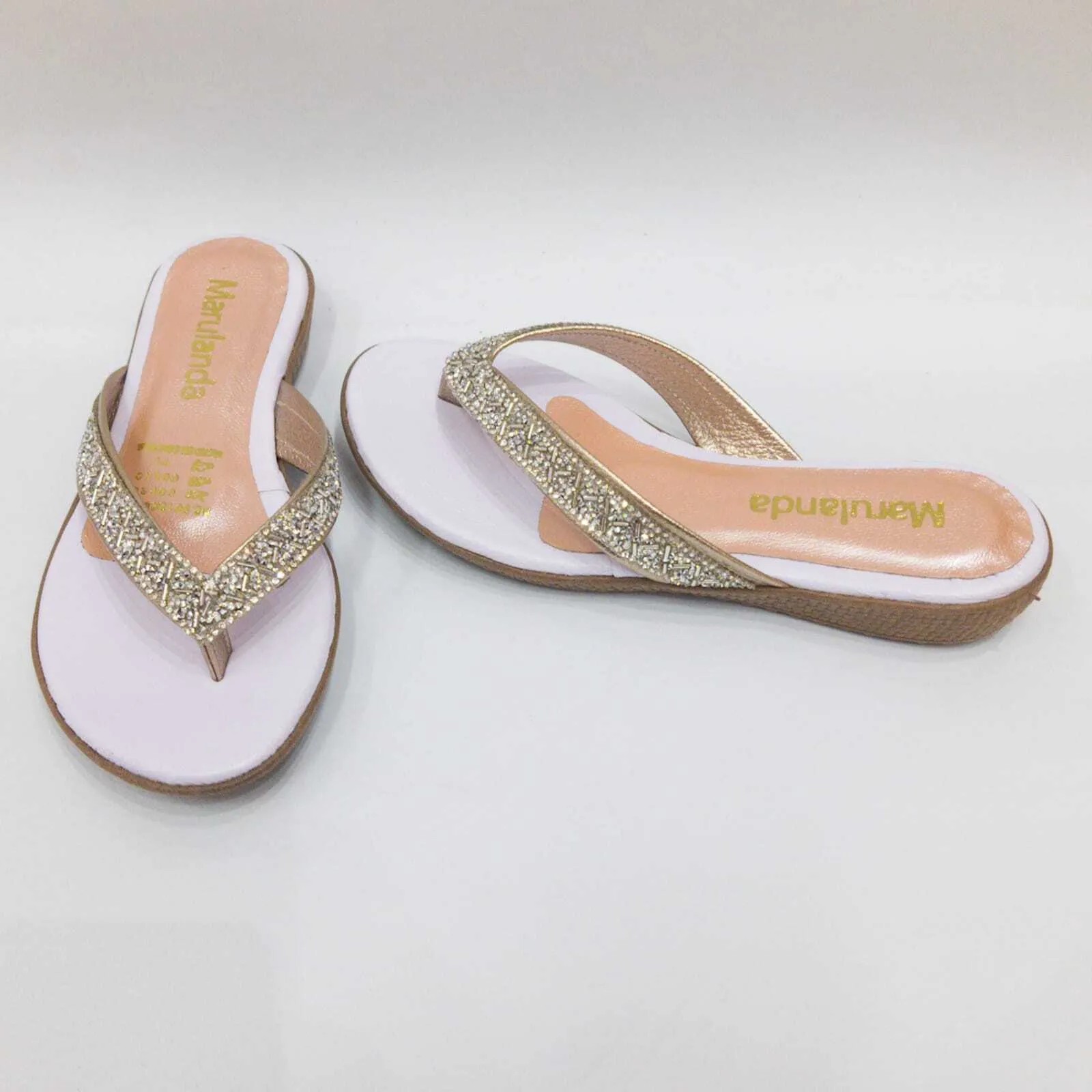 Sandalia plana tres puntadas en cuero tipo folia color dorado.